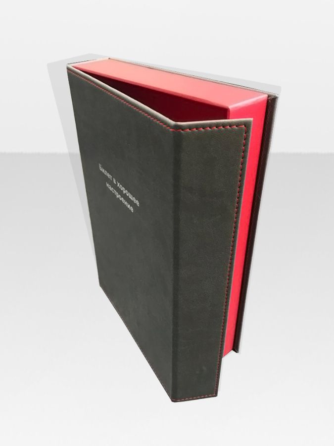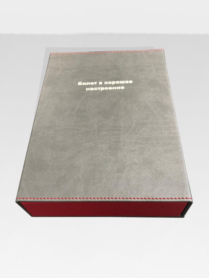 Коробка подарочная из переплетного картона. Снаружи оклеена искусственной кожей с последующей прострочкой и тиснением фольгой. Внутри имитлин. Клапан на магнитах.
