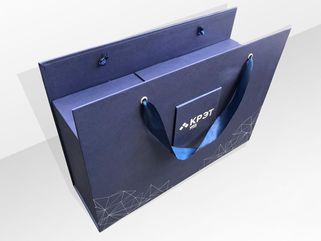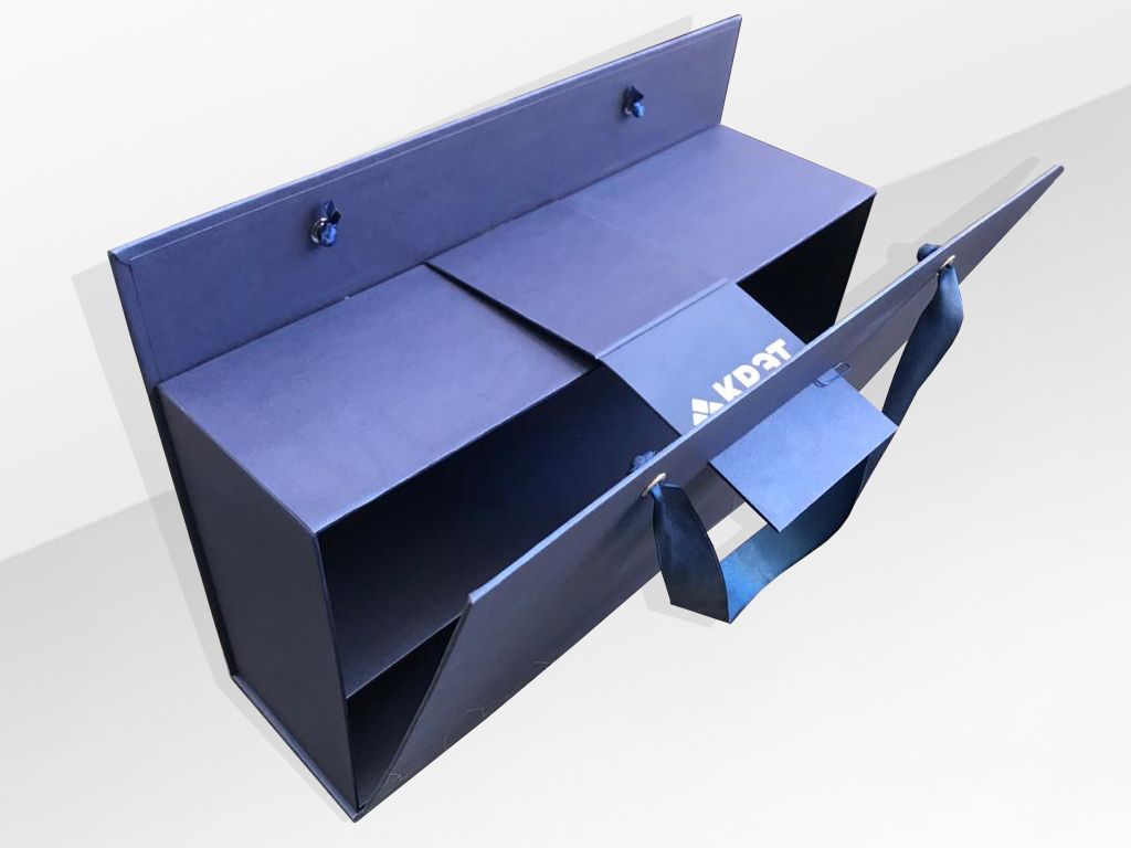 Коробка подарочная из переплетного картона, кашированного дизайнерской бумагой с последующей трафаретной печатью и тиснением фольгой. Ручки из атласной ленты, магниты на клапане.